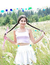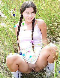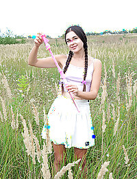 Lovely teen with cute braids blows soap bubbles and shows off her nice tits and sweet pussy